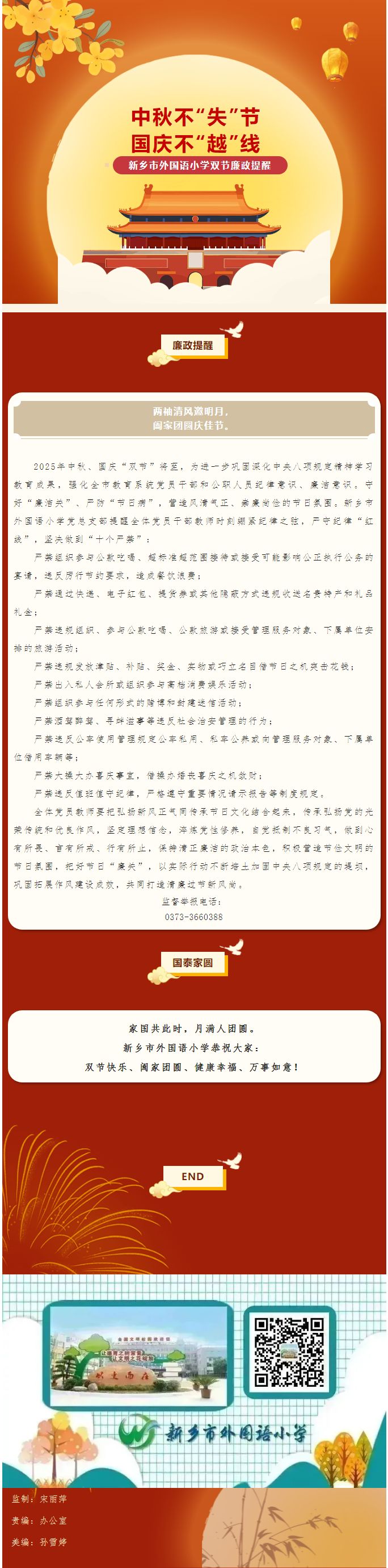 中秋不“失”节 国庆不“越”线——新乡市外国语小学双节廉洁提醒